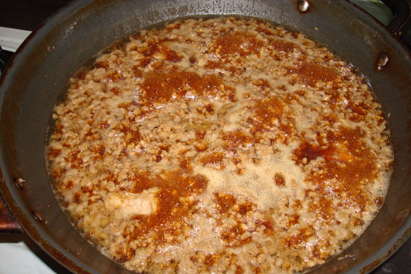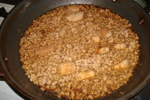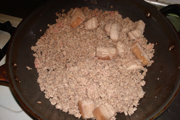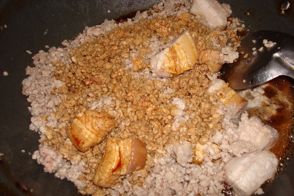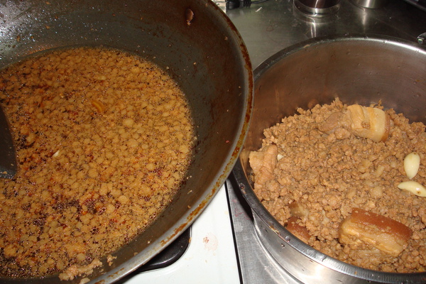 放入絞肉與肉塊拌炒,炒到肉塊的顏色都變成白色,且豬油也被炒出來即可進行下一步驟